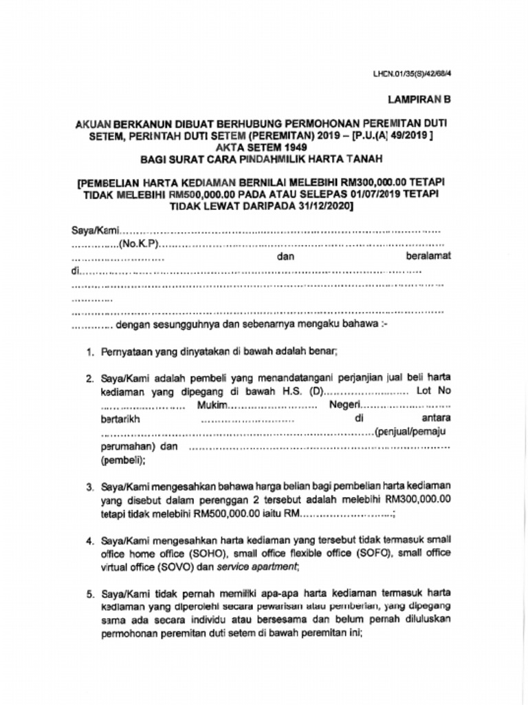 Related : Perintah Duti Setem (Peremitan) 2019 - Kerajaan bersetuju untuk memberi pengecualian duti setem bagi surat cara pembelian rumah dan surat cara perjanjian pinjaman untuk rumah yang dijual sepanjang tempoh kempen pemilikan rumah (hoc) diadakan dari januari hingga jun ini..