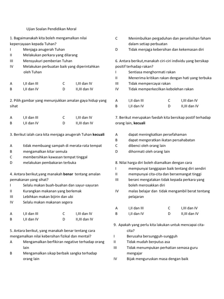 Mari dapatkan soalan ujian pertengahan tahun pendidikan moral tingkatan 3 pada bahagian muat turun dibawah. Senarai kertas soalan dan skema jawapan trial spm bagi mata pelajaran pendidikan moral ini akan dikemaskini dari masa ke masa. Koleksi soalan peperiksaan dan ujian pendidikan moral tahun 1,2,3,4,5,6. Garisjawapan yang betul.(10 markah) 21. Bengkel pemangkin kecemerlangan pendidikan moral spm tahun 2020 aplikasi google meet